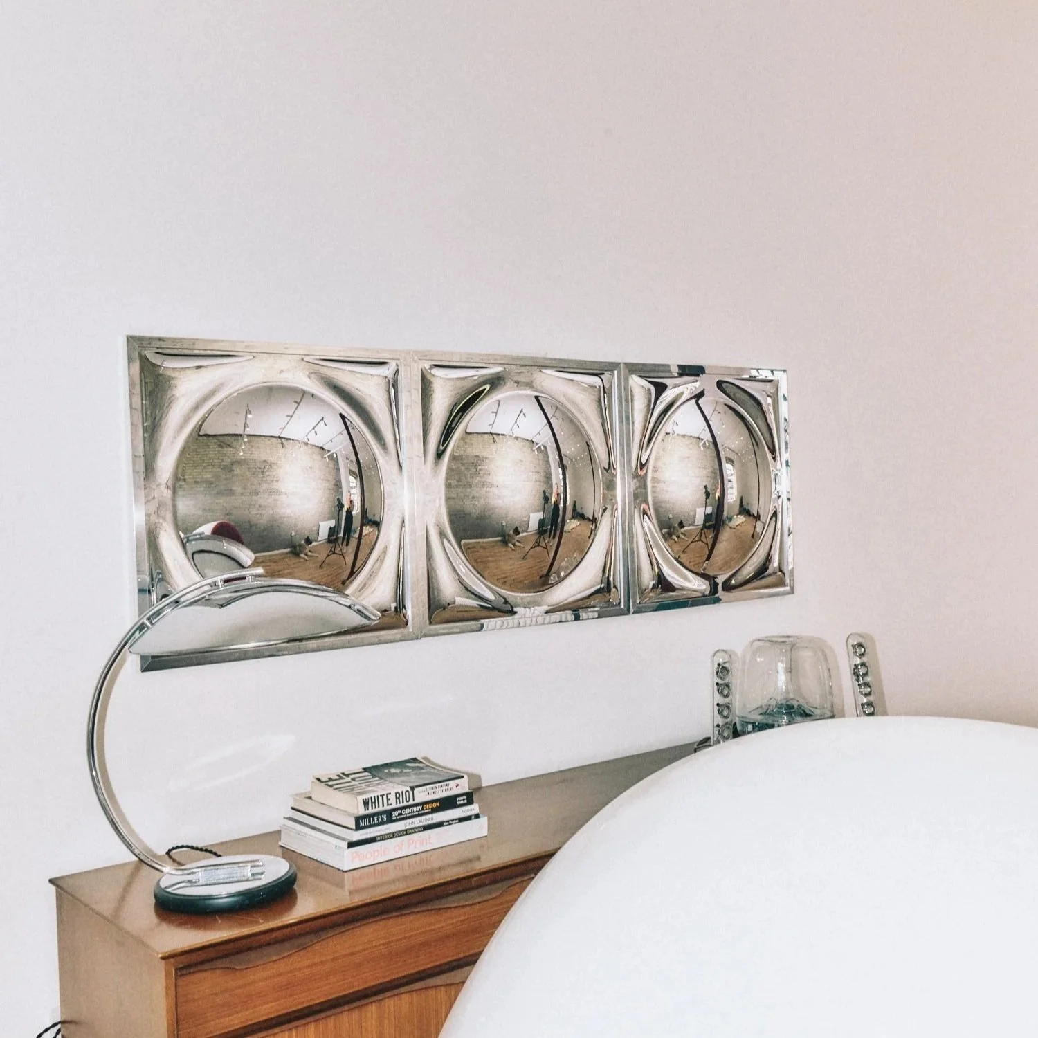 Or.bs are formed using a bespoke sculptural mould designed and produced by Club Century. The result is a three dimensional mirror panel that creates a fisheye reflection, blurring the boundary between art, object, and atmosphere.